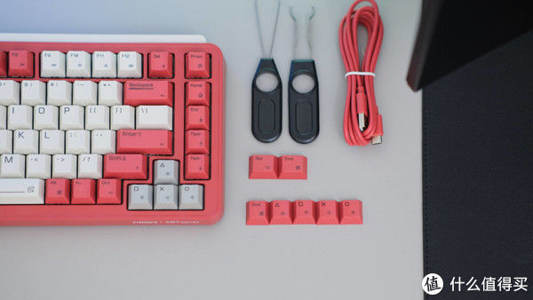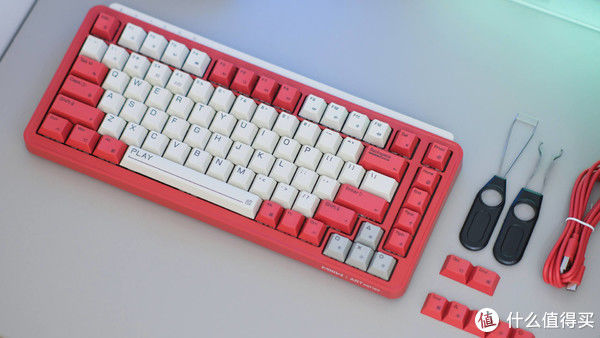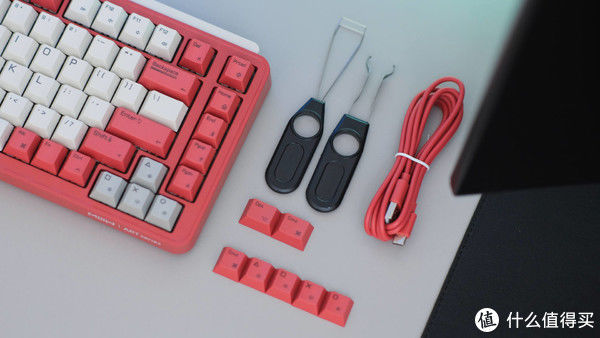 配件方面,除了键盘常见的数据线、接收器、说明书外,这款米物 ART 系列 Z830 机械键盘还配备有一只拔键器和一只拔轴器,因为这款键盘采用了目前常见的热插拔底座,支持标准 3PIN 或 5PIN 轴体,我们可以轻松刚换自己喜欢的轴体,实现在一把键盘上体验多种不用轴体的手感,也大大增加了键盘的可玩性。