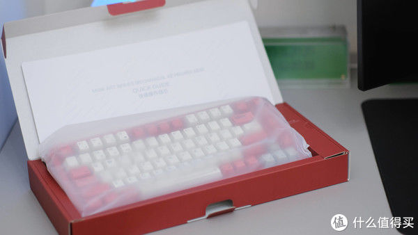 打开包装,可以看到键盘、配件都设计有专门的摆放位置,并且键盘出厂还有塑料罩保护。