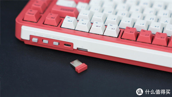 键盘的电源键、三模切换以及 Win/Mac 双系统切换都位于键盘顶端,Type-C 接口可以提供充电及有线连接功能,此外还设置有单独的接收器收纳仓,在不使用的时候可以起到很好的防丢作用。