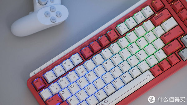 键帽采用 PBT 材质热升华工艺,字符印刷清晰,键帽带有轻微的磨砂质感,手感细腻,并且不易沾染指纹,有着抗打油、耐磨损的特性;同时等元素的加入也让键盘更具趣味性。